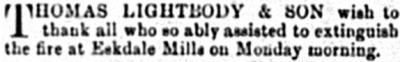 The mill had a fire in a loft in 1914, which damaged much of its yarn supply but not the main production facility. Fires were often handled by a communal response, in this case involving a large number of people shortly after 5.35 am when smoke was noticed by an early workman.