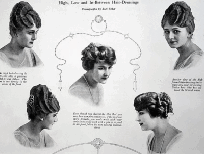 Women’s hairstyles became less elaborate during wartime, partly for thrift and also because of workplace practicalities. Nevertheless, many formal styles still had a high shape, often including marcelled waves. Some women continued to use formal hairstyles as a statement that the UK would not change its lifestyle due to enemy pressure.