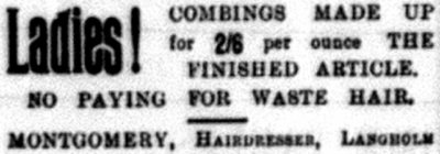 In addition to supply by mail order, switches could also be ‘made up’ by local hairdressers such as Alexander Montgomery by using ladies’ own ‘combings’ (collected loose hair).