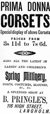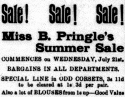 Isabella (‘Bella’) Pringle (1876-1924), a women’s and children’s clothier, started offering millinery services in 1915 (women’s and children’s hatmaking).