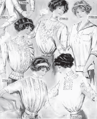 Another of Bella’s specialties was blouses (known as ‘waists’ in the USA). The high necklines of 1912 below were being replaced by V-shapes and plainer designs (top right in the picture below).