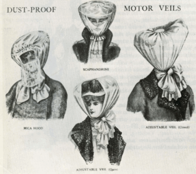 Motor cars were becoming more affordable and their open tops in the summer prompted the use of ‘motor veils’, included in the advert above and illustrated below.