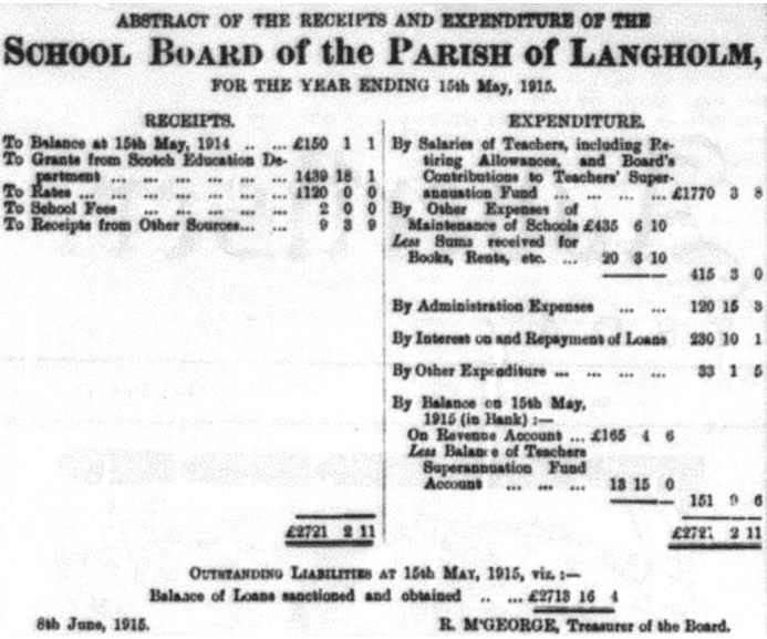 From the accounts below for the year ending 15th May 1915 (Whitsunday), it can be seen that the School Board income came mostly from grants from the Scotch Education Department* in London (£1,439) and from some of the rates collected by the Parish Council (£1,120). School fees were abolished in 1890.