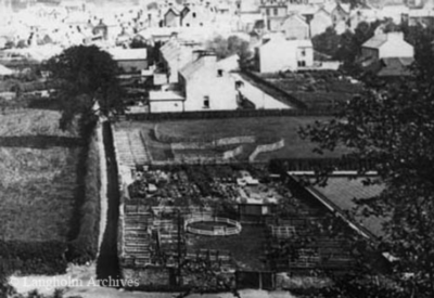 Livestock auctions were held periodically in Langholm by the firm R Harrison & Son of Carlisle. The auction site with a ring and pens can be seen in the foreground of the photo below. To the right is the green of the Old Town Bowling Club.